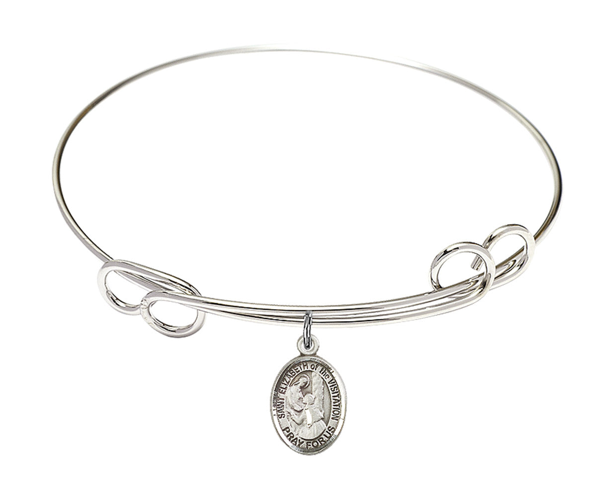 Made with rhodium-plated or gold-plated hand-wrapped wire bangles and Sterling Silver or 14kt Gold-Filled charm-size (1/2 x 1/4 inch) patron saint medals.Elizabeth was the cousin of the Virgin Mary and mother of St. John the Baptist. She was visited by Gabriel, who prophesized her giving birth, and was visited by Mary when She was also announced to conceive later. Nothing else is known or said about her beforehand or afterward.