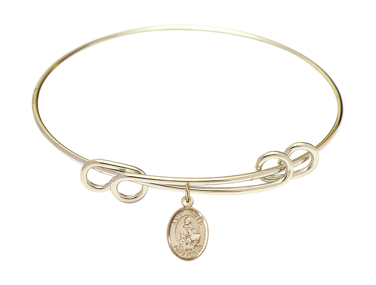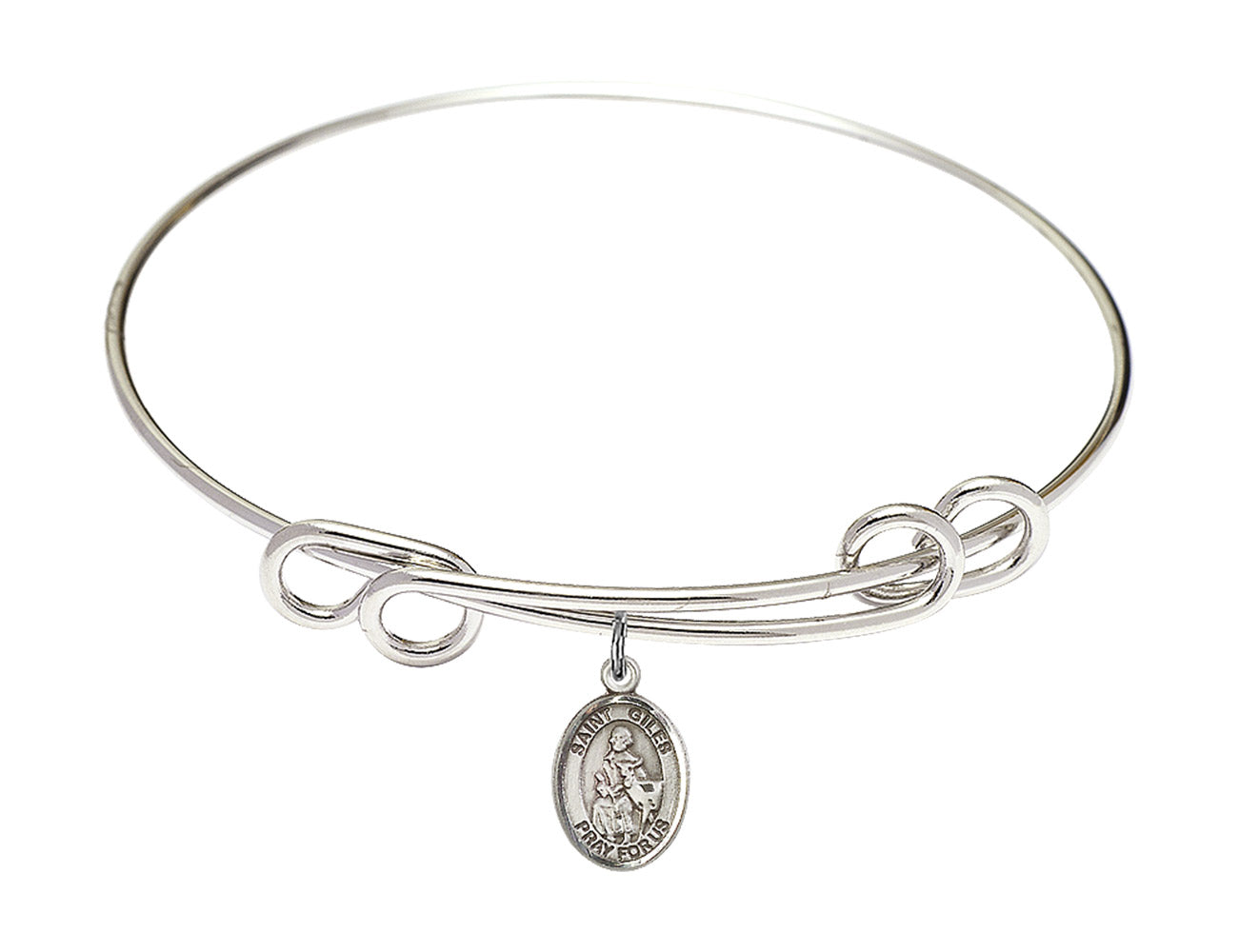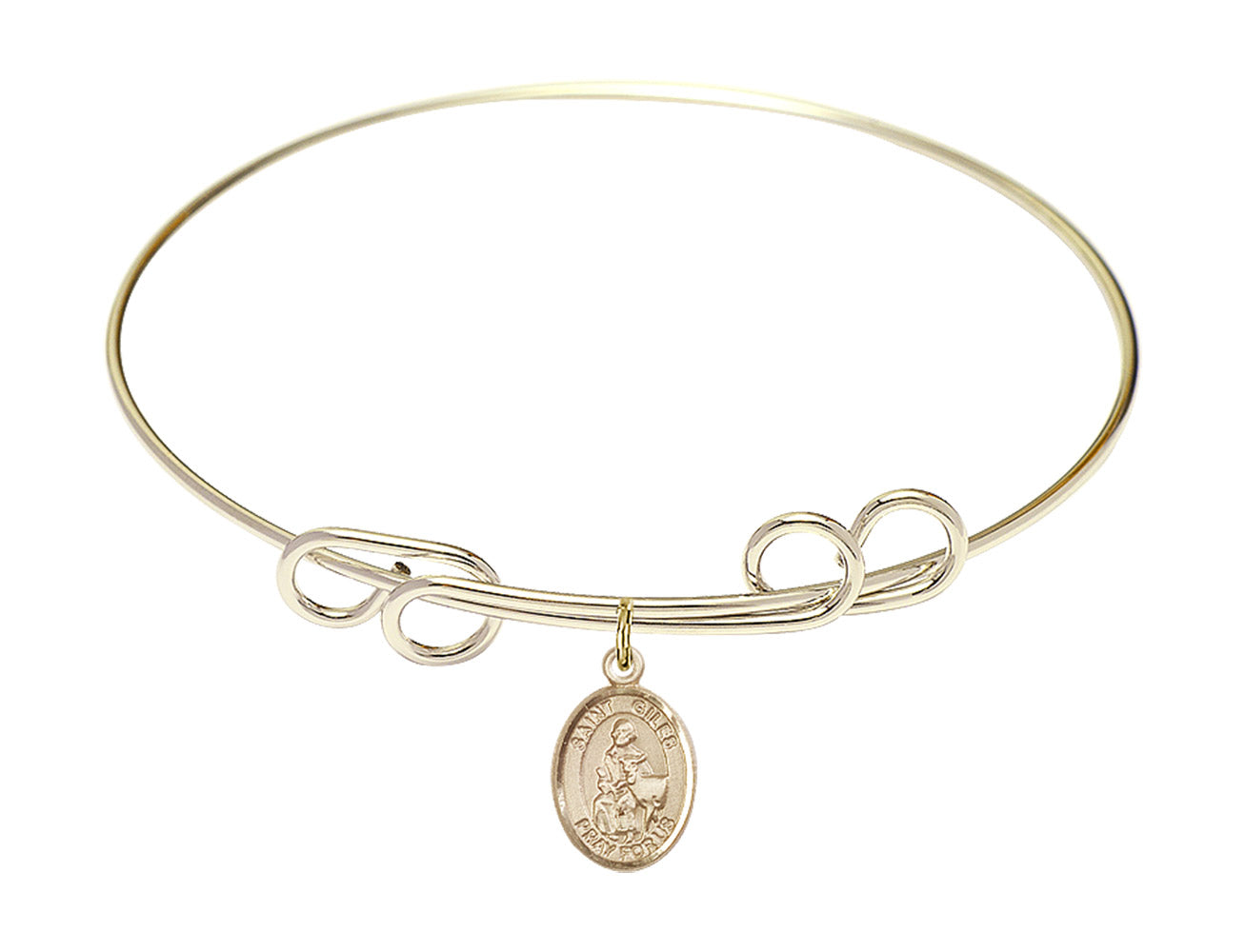 Made with rhodium-plated or gold-plated hand-wrapped wire bangles and Sterling Silver or 14kt Gold-Filled charm-size (1/2 x 1/4 inch) patron saint medals.Born into a royal family in Athens, Giles wanted to avoid the popularity that came with royalty. After the death of his parents, he lived alone in solitary (Giles the Hermit). While living in a forest in Nimes on a vegetarian diet, he was found by anarchist King Wamba, whose troops accidentally crippled him with an arrow while hunting deer. King Wamba held Giles in high esteem and built him a monastery, Saint-Gilles-du-Gard, kept under Benedictine rule. He died in his monastery with the highest repute for sanctity and miracles.