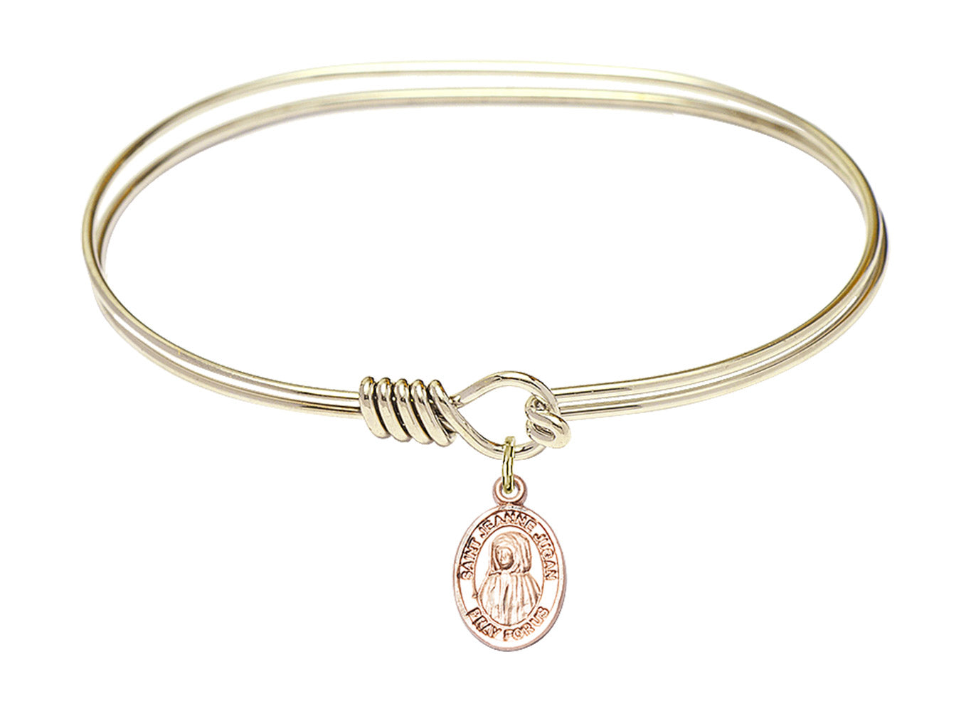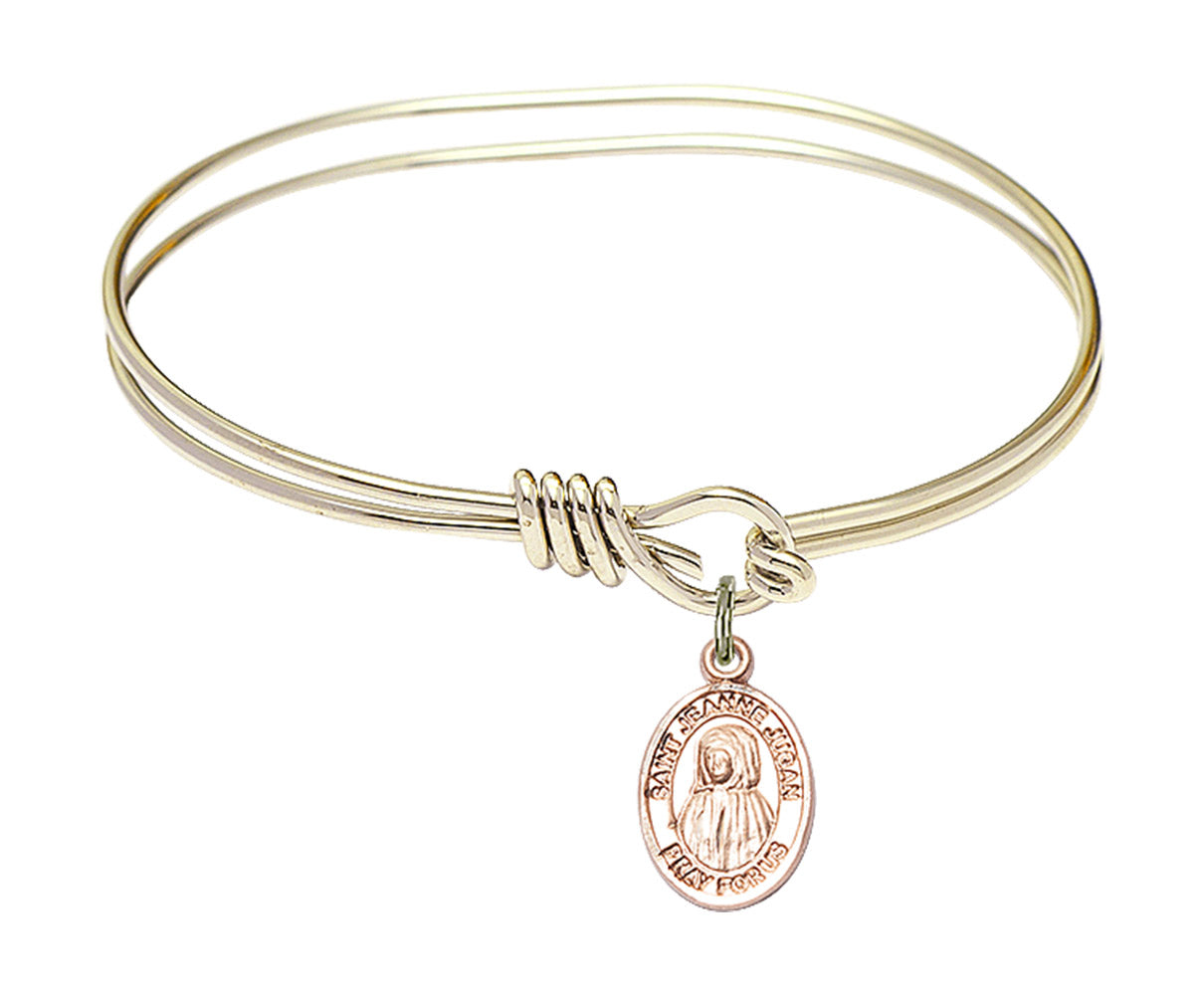 Made with rhodium-plated or gold-plated hand-wrapped wire bangles and Sterling Silver or 14kt Gold-Filled charm-size (1/2 x 1/4 inch) patron saint medals.Jeanne was known as a Mystic. As a teenager, she wished to help the poor and the elderly, eventually doing so as an adult. Collecting funds and teaching catechism, she gained a following of sisters and eventually founded the Little Sisters of the Poor. Calling herself Mother Mary of the Cross, she continued her work until her retirement.