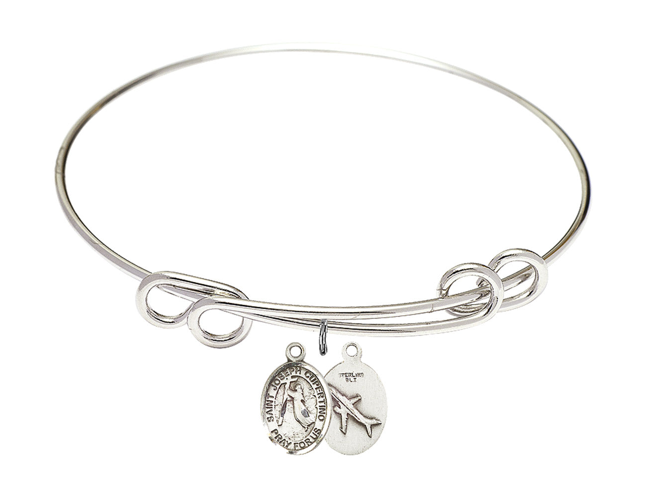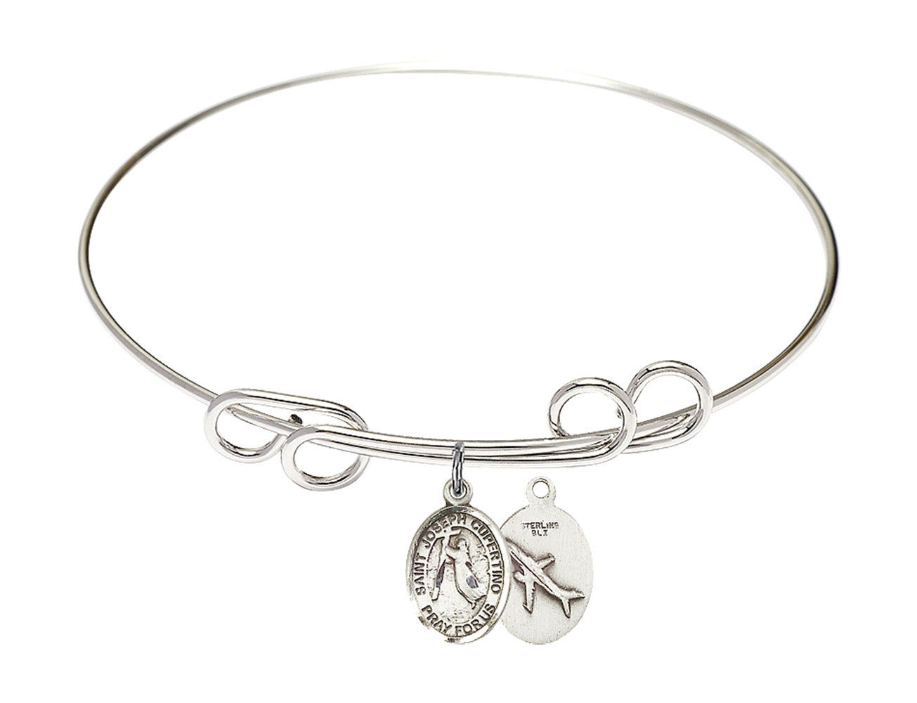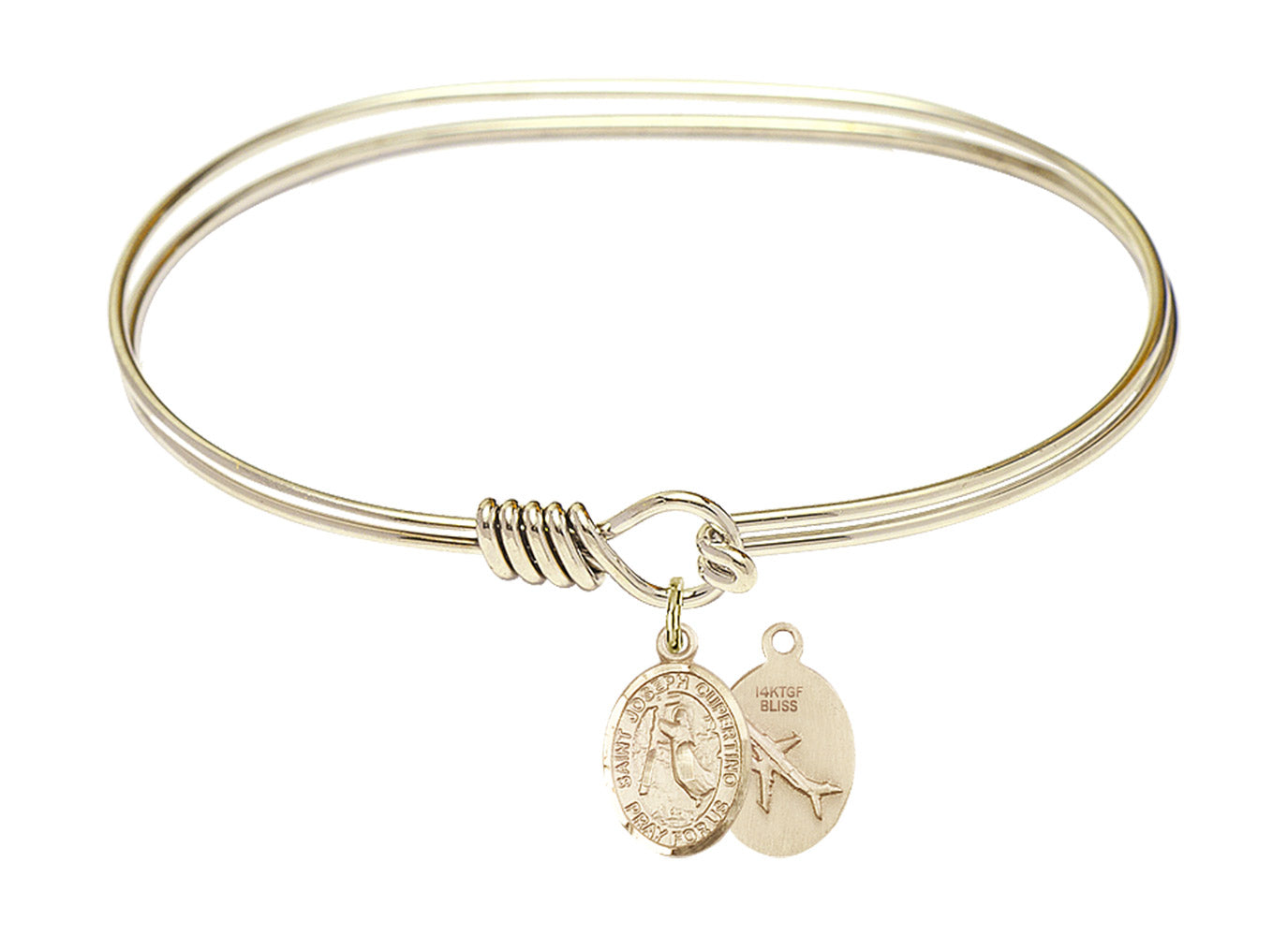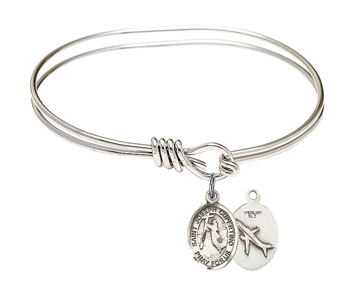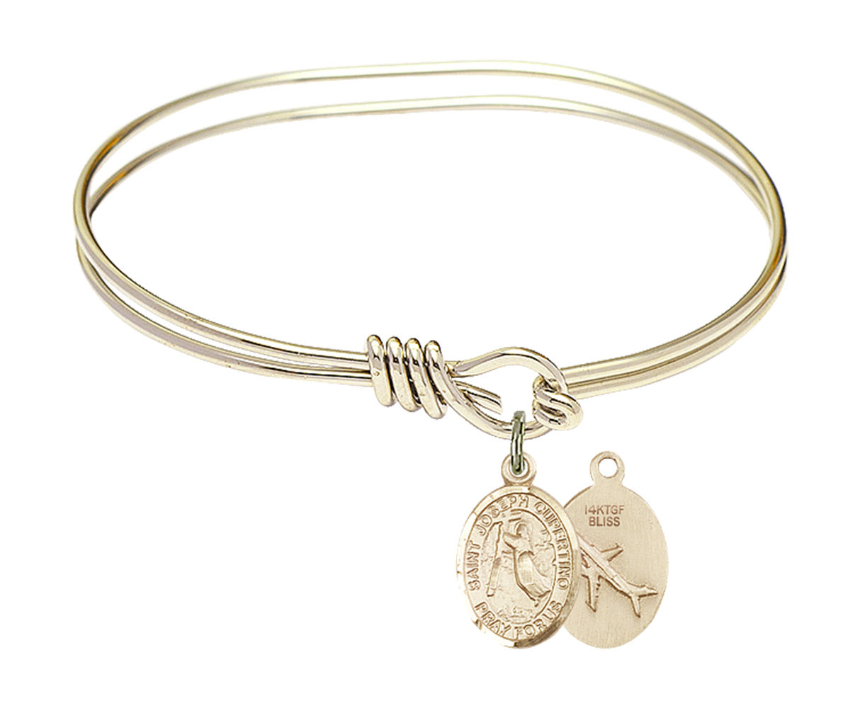 Made with rhodium-plated or gold-plated hand-wrapped wire bangles and Sterling Silver or 14kt Gold-Filled charm-size (1/2 x 1/4 inch) patron saint medals.Joseph was an ignorant and poor child, who failed at shoemaking and became a priest. He was well known for his ability to miraculously levitate, leading to his patronage of all things flying. He was devoted to God and his life was overwhelmed with trances of happiness whenever the Faith was mentioned. Although he was not allowed to participate in the regular events of mass, and was moved around from one Capuchin or Franciscan house to another, he remained joyous and loyal to his faith.