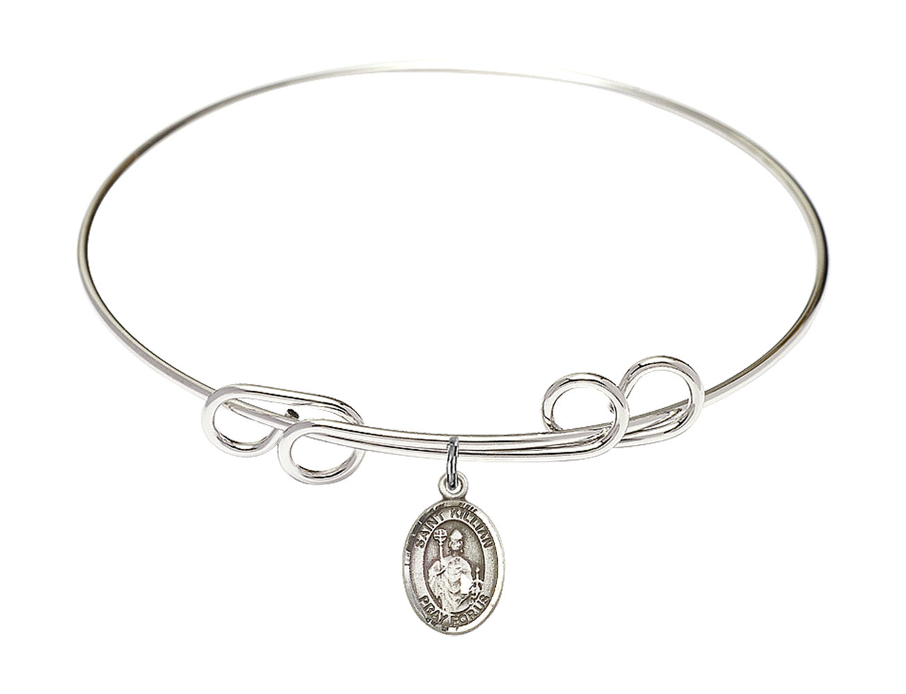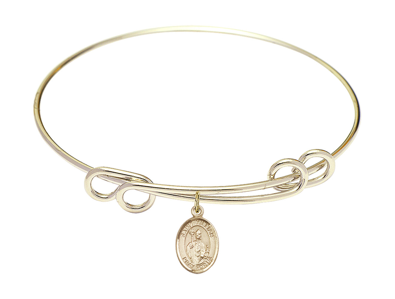 Made with rhodium-plated or gold-plated hand-wrapped wire bangles and Sterling Silver or 14kt Gold-Filled charm-size (1/2 x 1/4 inch) patron saint medals.Saint Kilian was of Irish nobility, and became a Missionary bishop. He converted a local Bavarian ruler and his subjects to the Faith. After explaining to the ruler that his marriage to his brother's widow was invalid to the Church, he was martyred. There are conflicting stories as to who assassinated Our Saint, some tales point to the wife, others to the Duke.