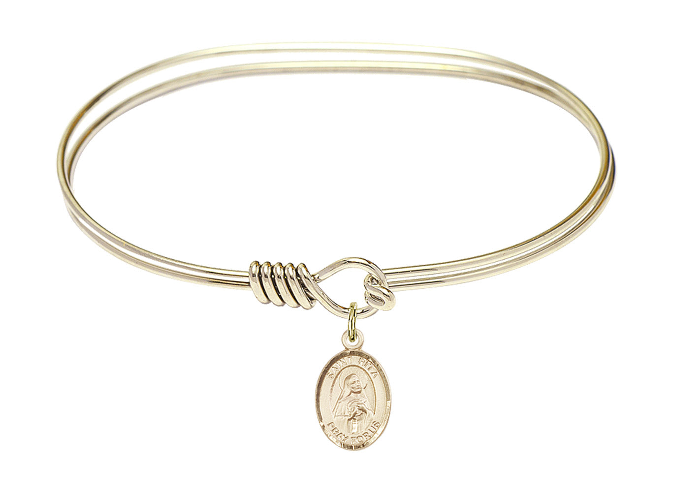 Made with rhodium-plated or gold-plated hand-wrapped wire bangles and Sterling Silver or 14kt Gold-Filled charm-size (1/2 x 1/4 inch) patron saint medals.Born as Margherita Lotti, St. Rita's original goal was to become a nun, but was forced into marriage and raised twin sons, until their deaths. After several attempts, she was accepted into the Augustinian nun convent, where she lived for over 40 years. She received a spiritual vision in which she received a forehead wound similar to Jesus's after wearing his thorned crown, which was said to bleed for 15 years.