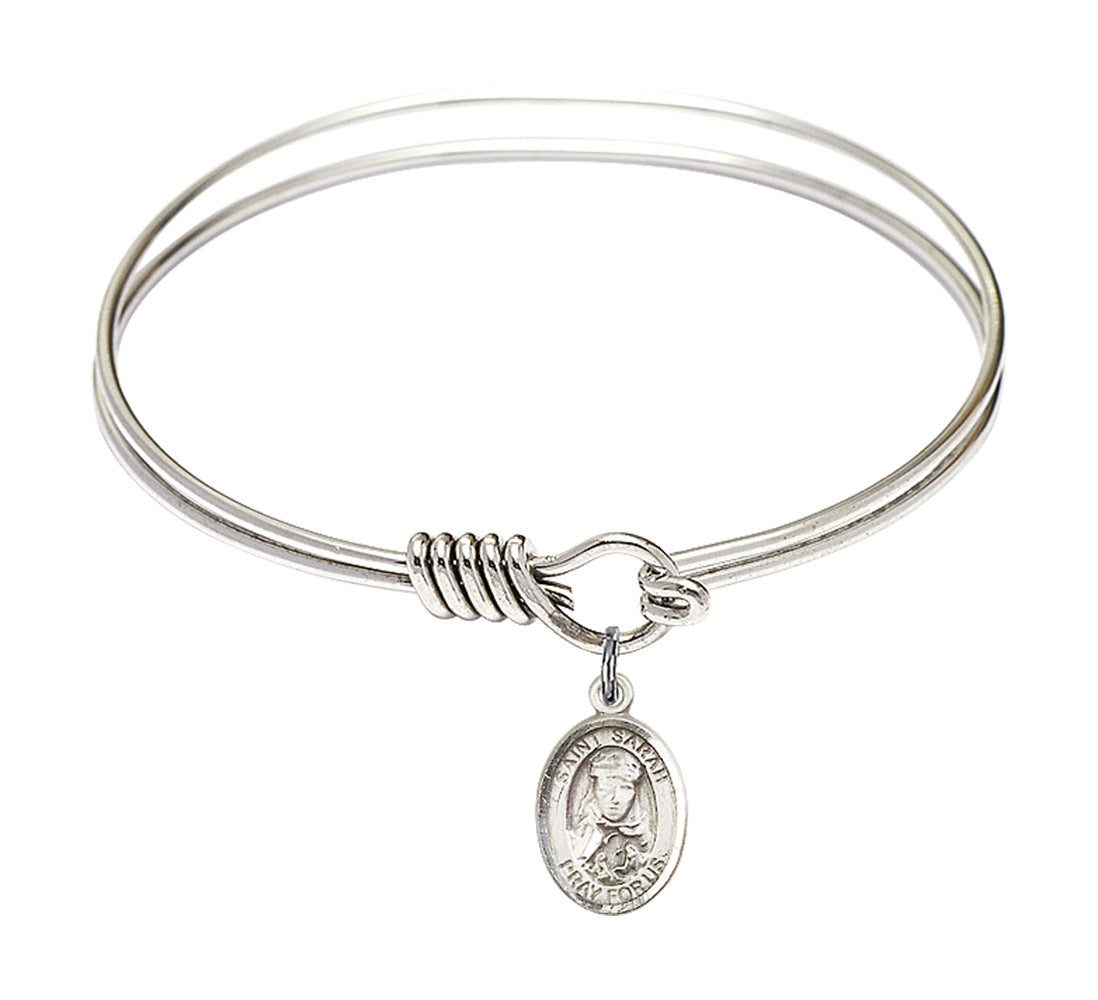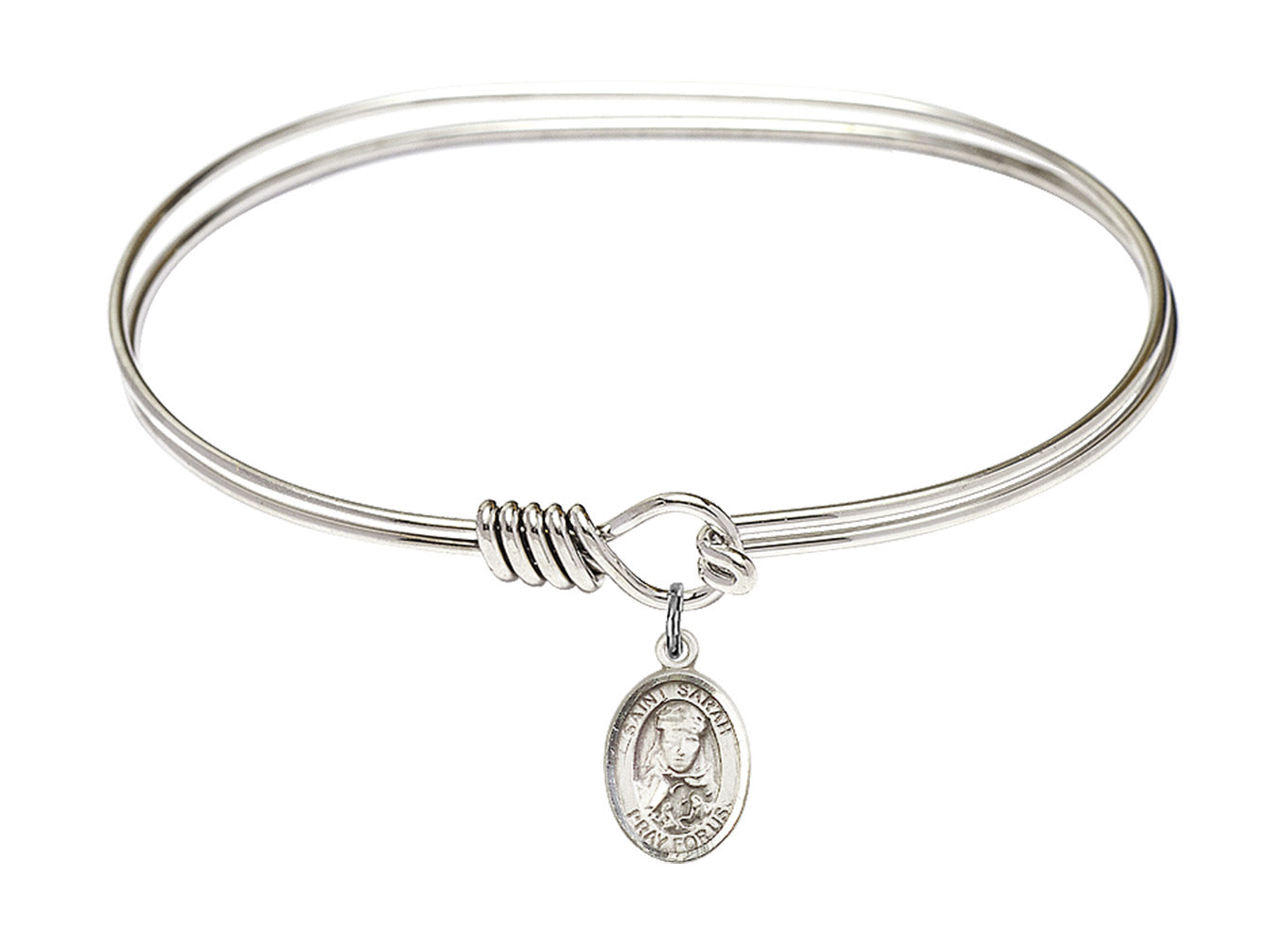 Made with rhodium-plated or gold-plated hand-wrapped wire bangles and Sterling Silver or 14kt Gold-Filled charm-size (1/2 x 1/4 inch) patron saint medals.Known formerly as Sarai, the wife of Abraham was believed to be infertile. The couple lived in the desert of Canaan when they were visited by The Lords Angels. Abraham was 100 and Sarah 90 years old at the time of the visitation, and they were told they were to have a son, at which Sarah laughed. When her son was born he was named Isaac, which means laughter. She died at the age of 127, and was buried in the Machpelah Cave near Hebron.
