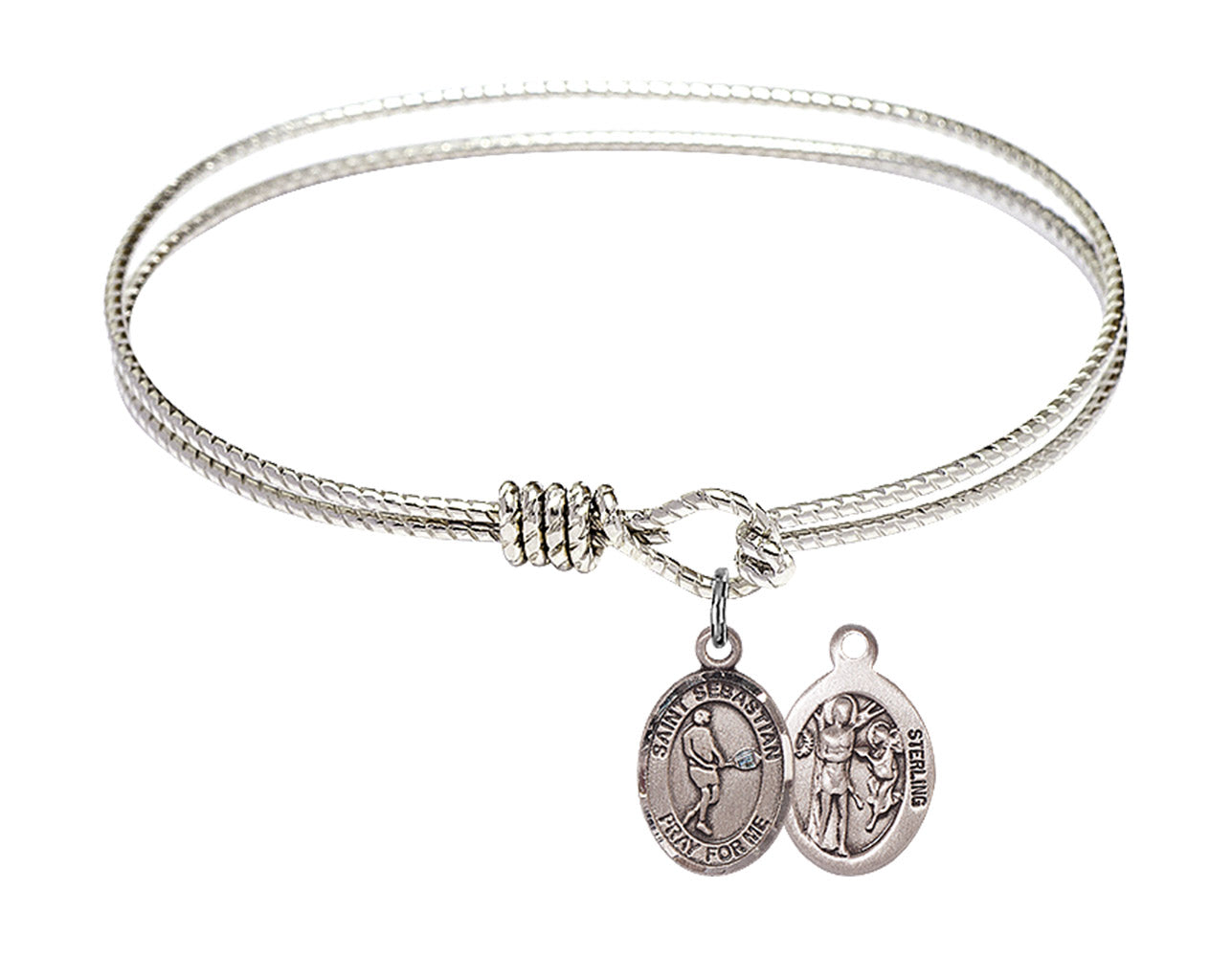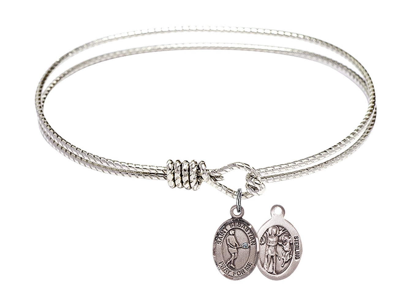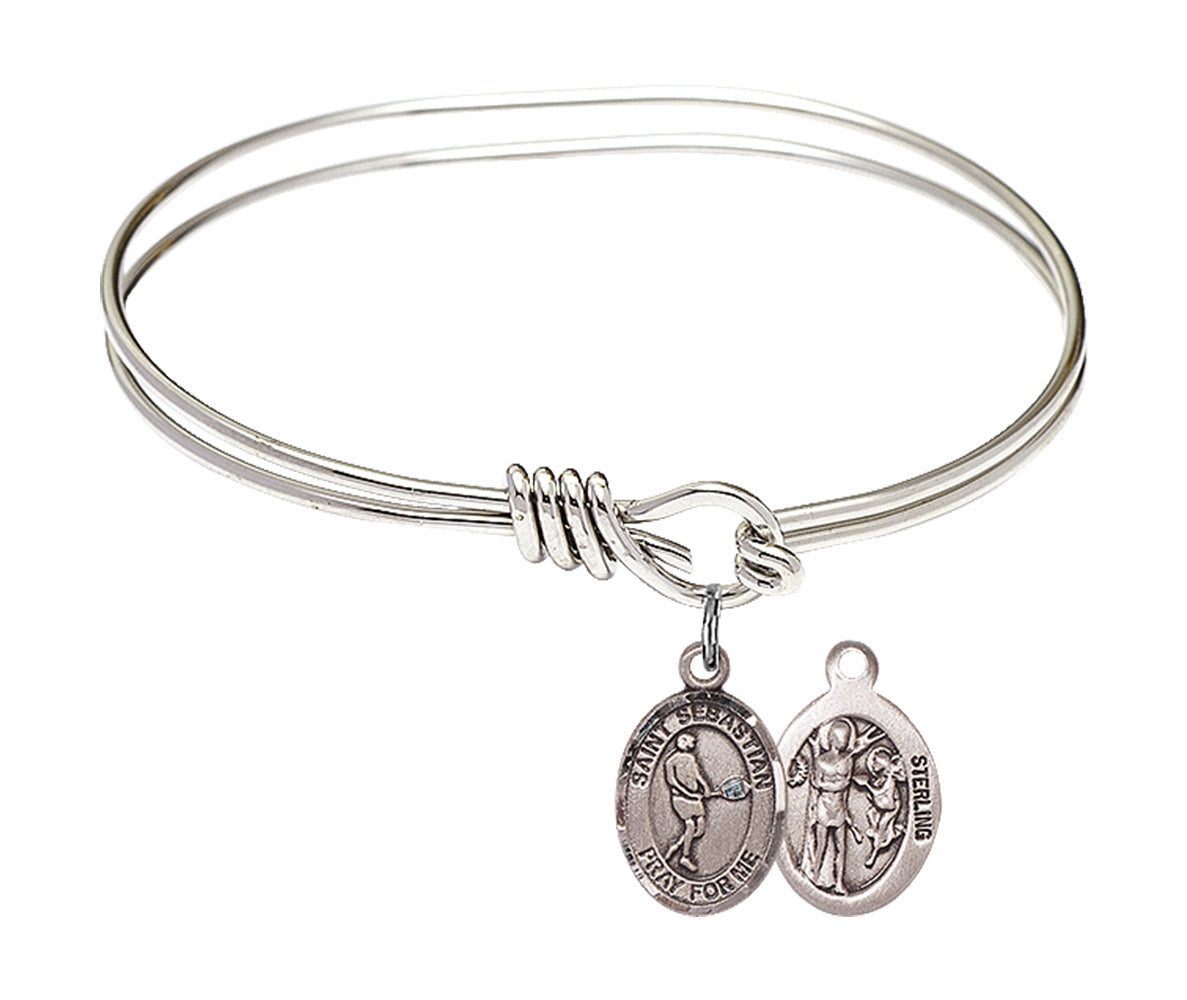 Made with rhodium-plated or gold-plated hand-wrapped wire bangles and Sterling Silver or 14kt Gold-Filled charm-size (1/2 x 1/4 inch) patron saint medals.Sebastian, a soldier in the Roman Army, was persecuted by Emperor Diocletian for his faith. Sentenced to death by being shot with arrows, his punishment is the most common depiction of his martyrdom. Healed by Irene, who was sent to bury him, he appeared before Diocletian, admonishing his efforts, before being clubbed to death.