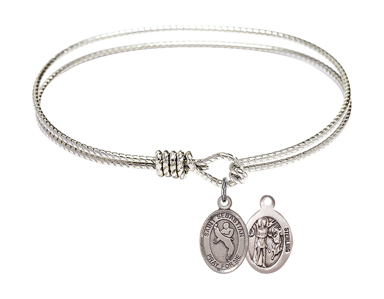 Made with rhodium-plated or gold-plated hand-wrapped wire bangles and Sterling Silver or 14kt Gold-Filled charm-size (1/2 x 1/4 inch) patron saint medals.Sebastian, a soldier in the Roman Army, was persecuted by Emperor Diocletian for his faith. Sentenced to death by being shot with arrows, his punishment is the most common depiction of his martyrdom. Healed by Irene, who was sent to bury him, he appeared before Diocletian, admonishing his efforts, before being clubbed to death.