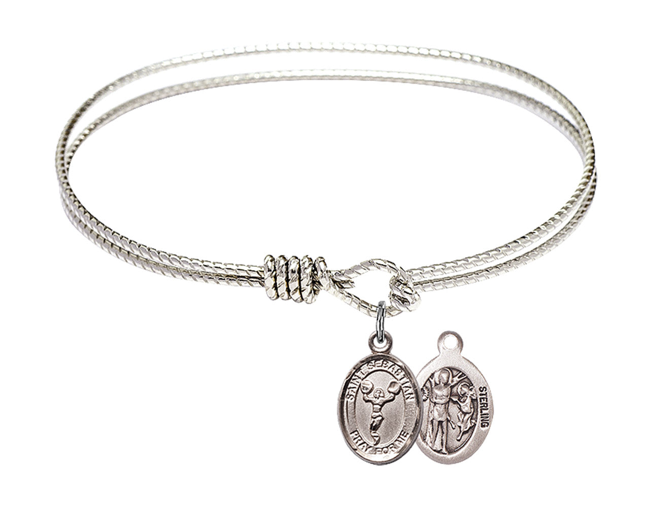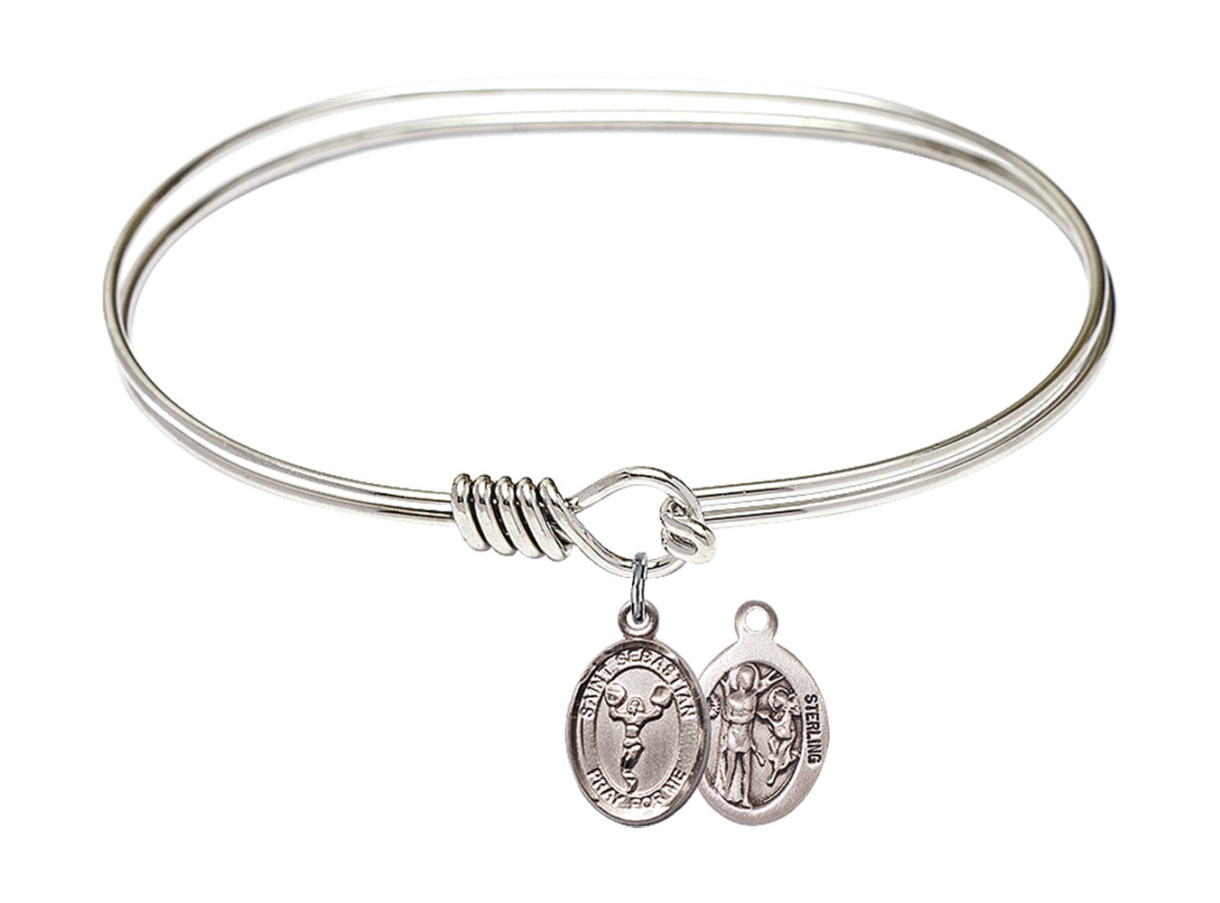 Made with rhodium-plated or gold-plated hand-wrapped wire bangles and Sterling Silver or 14kt Gold-Filled charm-size (1/2 x 1/4 inch) patron saint medals.Sebastian, a soldier in the Roman Army, was persecuted by Emperor Diocletian for his faith. Sentenced to death by being shot with arrows, his punishment is the most common depiction of his martyrdom. Healed by Irene, who was sent to bury him, he appeared before Diocletian, admonishing his efforts, before being clubbed to death.