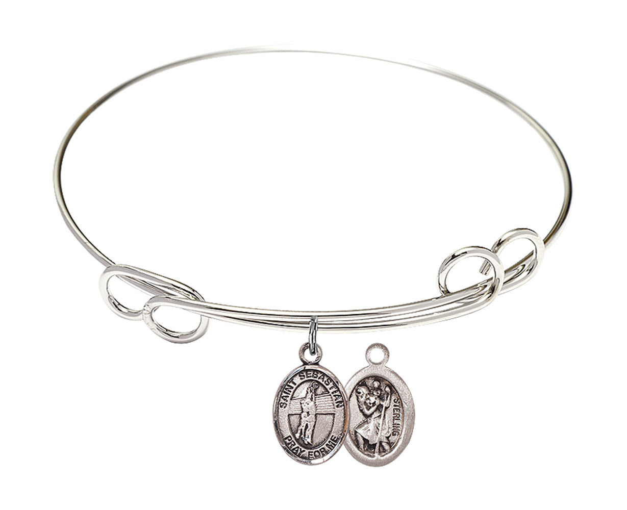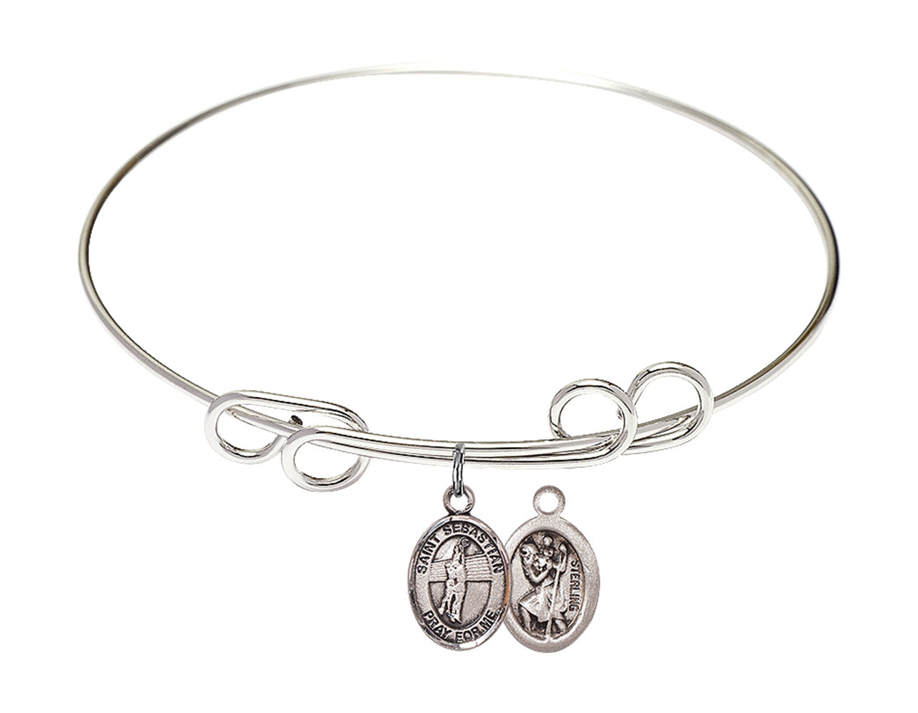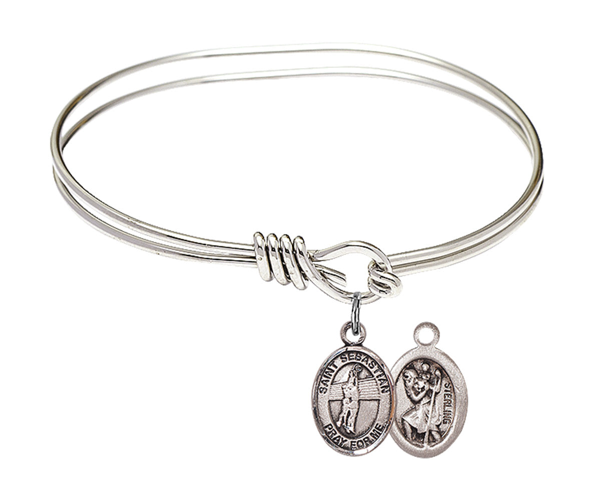 Made with rhodium-plated or gold-plated hand-wrapped wire bangles and Sterling Silver or 14kt Gold-Filled charm-size (1/2 x 1/4 inch) patron saint medals.Sebastian, a soldier in the Roman Army, was persecuted by Emperor Diocletian for his faith. Sentenced to death by being shot with arrows, his punishment is the most common depiction of his martyrdom. Healed by Irene, who was sent to bury him, he appeared before Diocletian, admonishing his efforts, before being clubbed to death.