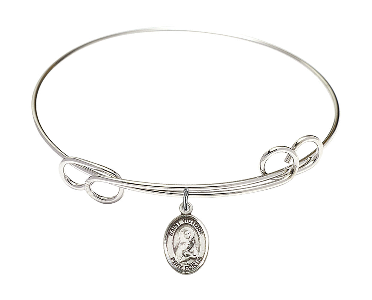 Made with rhodium-plated or gold-plated hand-wrapped wire bangles and Sterling Silver or 14kt Gold-Filled charm-size (1/2 x 1/4 inch) patron saint medals.Sister of St. Anatolia and St. Audax, she and her sister Anatolia refused to marry non-Christian suitors, to instead remain virgins. Both were imprisoned and tortured, but both still refused the men and converted other guards and prisoners. Victoria's suitor soon gave up and executed her. Legend says, he was instantly struck with leprosy and died 6 days later.