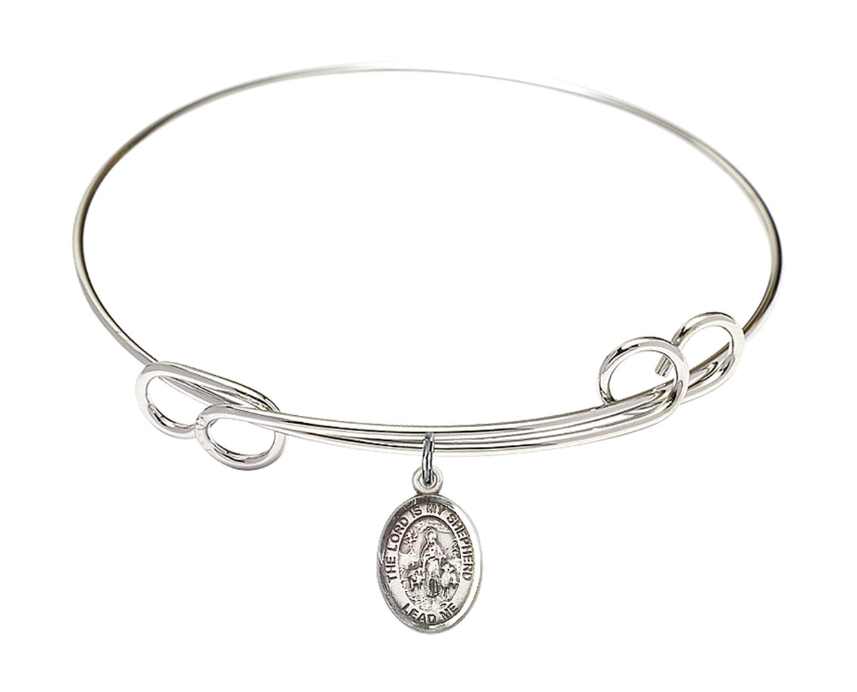 Made with rhodium-plated or gold-plated hand-wrapped wire bangles and Sterling Silver or 14kt Gold-Filled charm-size (1/2 x 1/4 inch) patron saint medals.Psalm 23 is widely known among both Christian and Jewish traditions. Written by David in both the New Testament and Hebrew Bible, he compares himself as a sheep, and God as the shepherd that guides him.