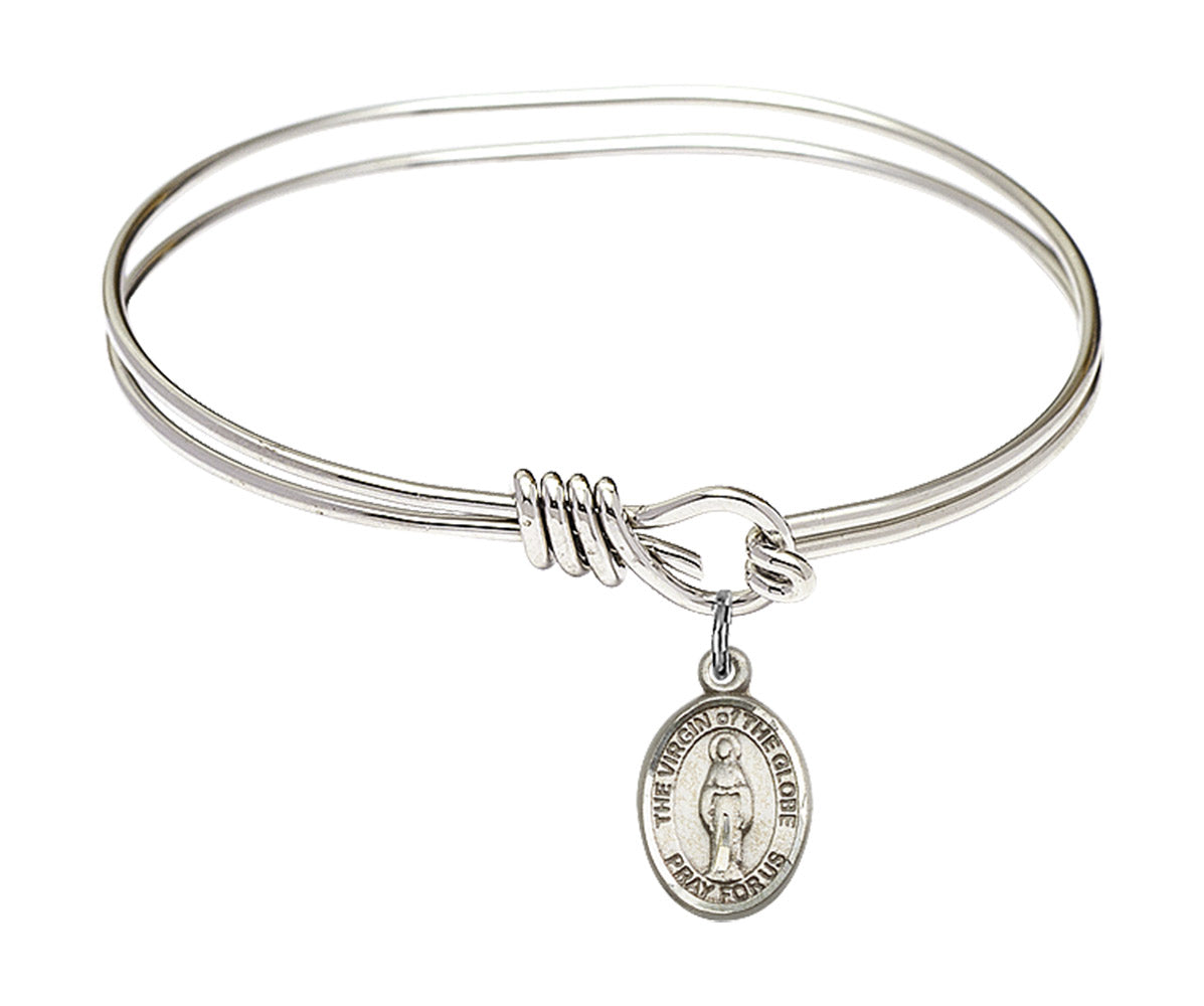 Made with rhodium-plated or gold-plated hand-wrapped wire bangles and Sterling Silver or 14kt Gold-Filled charm-size (1/2 x 1/4 inch) patron saint medals.An apparition of the Virgin Mary appeared before St. Catherine Laboure, telling her She would give graces to those who pray to Her. One vision told her to forge a medal for people devoted to Her to wear, which later became the 'Virgin of the Globe.' The Globe represents a visage Mary gave to Catherine to depict on the medal.