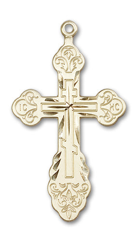 This cross is 1 7/8 x 1 inches in size. Our handmade crosses are available in Sterling Silver, 14kt Yellow Gold, and 14kt Gold-Filled. Choose a custom chain of your own styling.