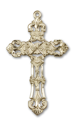 This cross is 2 1/8 x 1 1/4 inches in size. Our handmade crosses are available in Sterling Silver, 14kt Yellow Gold, and 14kt Gold-Filled. Choose a custom chain of your own styling.