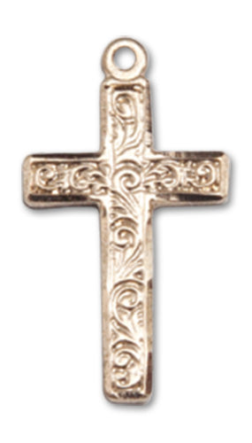 This cross is 1 1/2 X 7/8 inches in size. Our handmade crosses are available in Sterling Silver, 14kt Yellow Gold, and 14kt Gold-Filled. Choose a custom chain of your own styling.